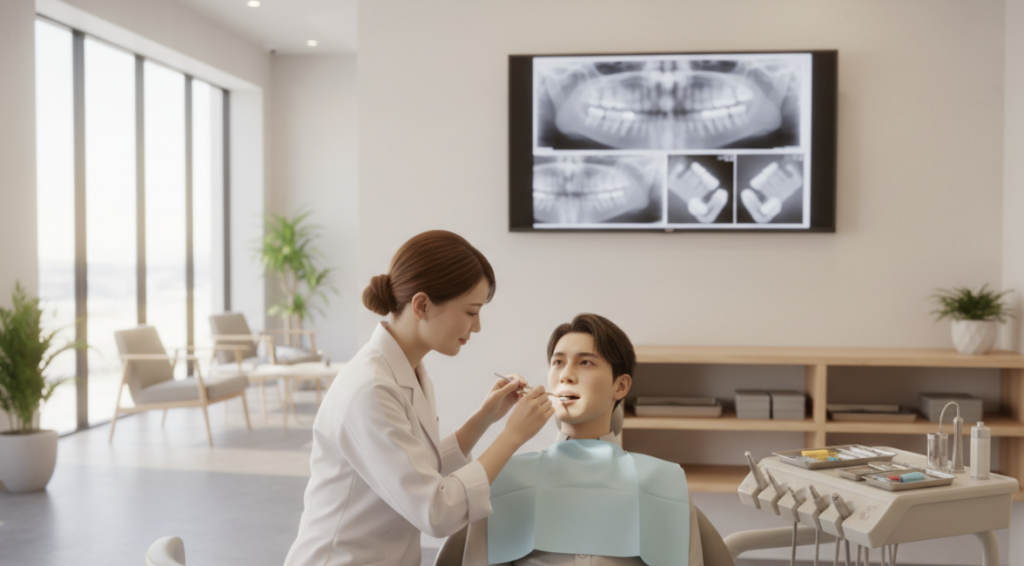長尾歯科医院では、矯正だけでなくお口全体を総合的に診断しています。レントゲンで歯一本一本の状態を確認し、虫歯や歯周病リスク、噛み合わせのバランスまで考慮した治療計画を提案しています。